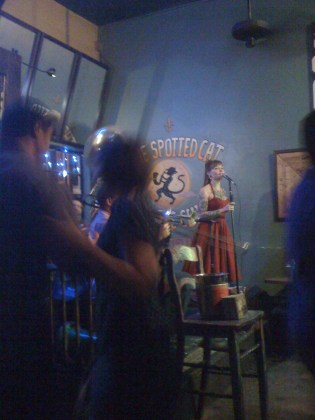 Lo and behold two days ago I walked into The Spotted Cat in New Orleans to find Giselle Anguizola teaching a beginner swing dance lesson with Brett Richardson on Piano and Paul Tenderloin on Washtub Bass playing music for her students to practice to.